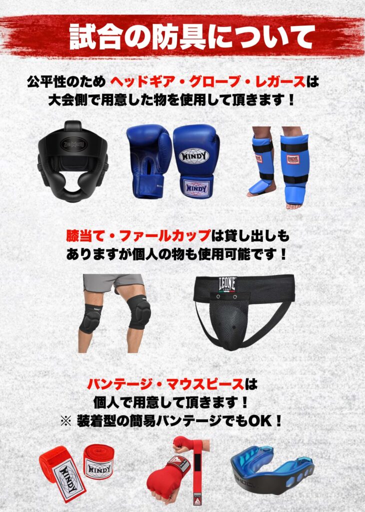 A:運営側で「ヘッドギア」「16ozグローブ」「ファールカップ」「レガース」「膝当て」を